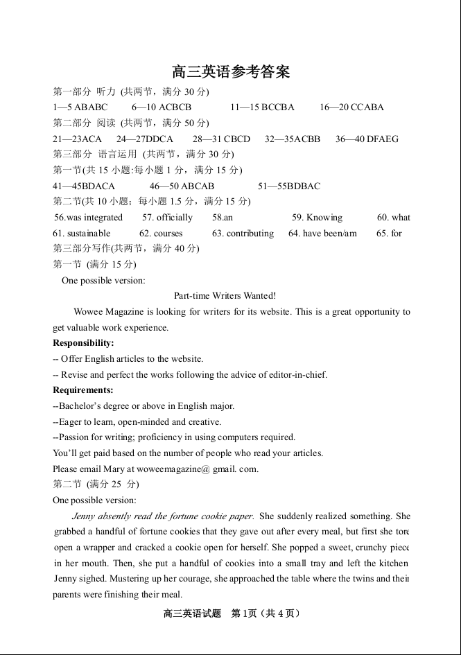 山东省潍坊市五县区2020.10高三年级阶段性监测试题英语答案