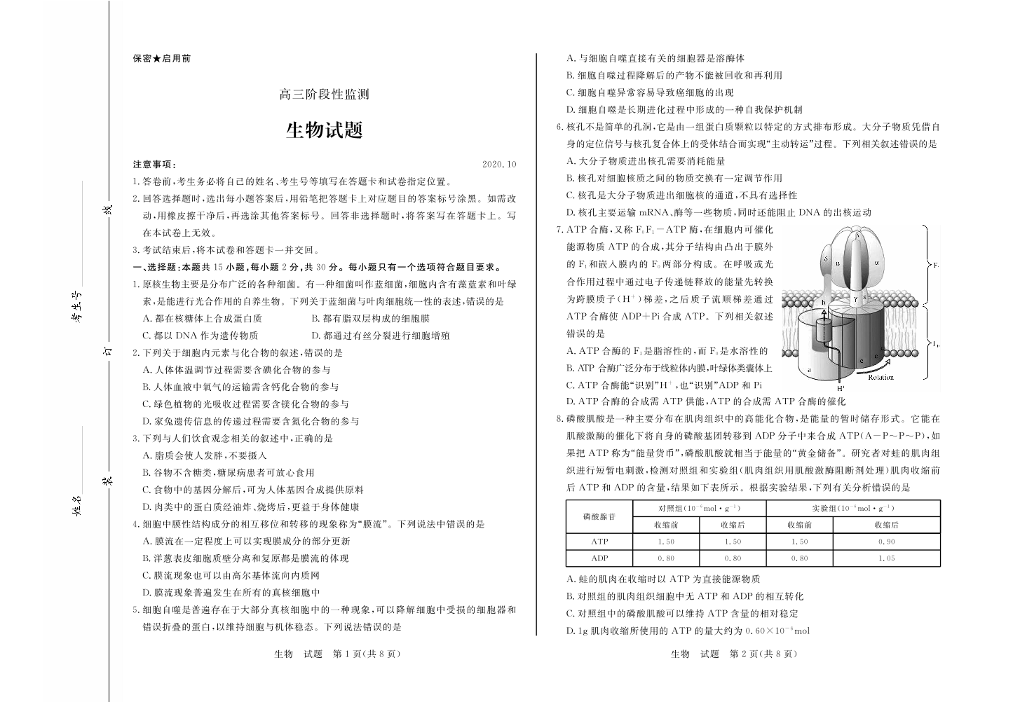 山东省潍坊市五县区2020.10高三年级阶段性监测试题生物