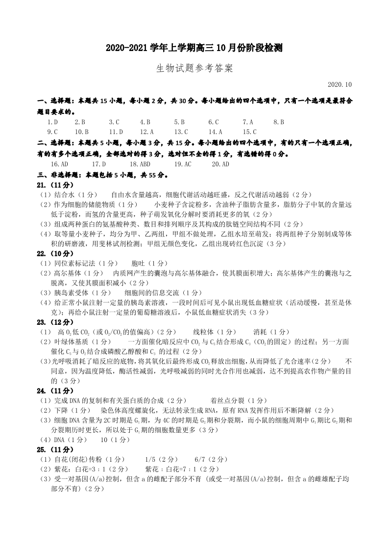 山东省潍坊市五县区2020.10高三年级阶段性监测试题生物答案
