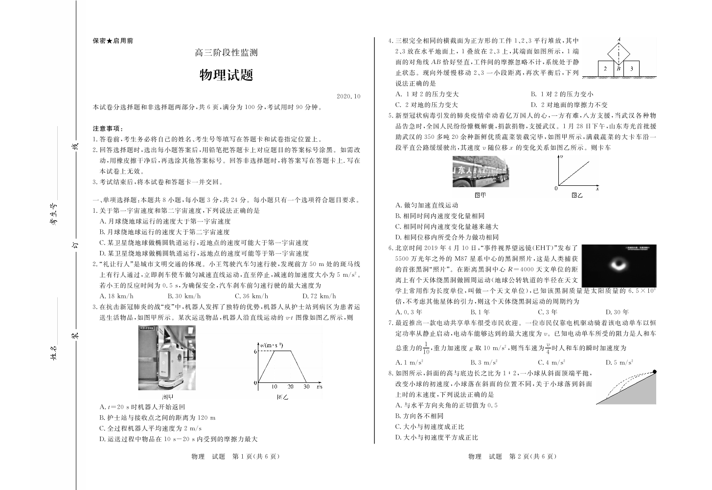 山东省潍坊市五县区2020.10高三年级阶段性监测试题物理