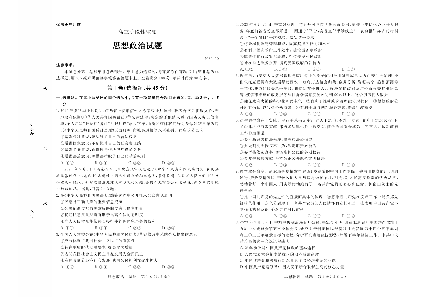 山东省潍坊市五县区2020.10高三年级阶段性监测试题政治