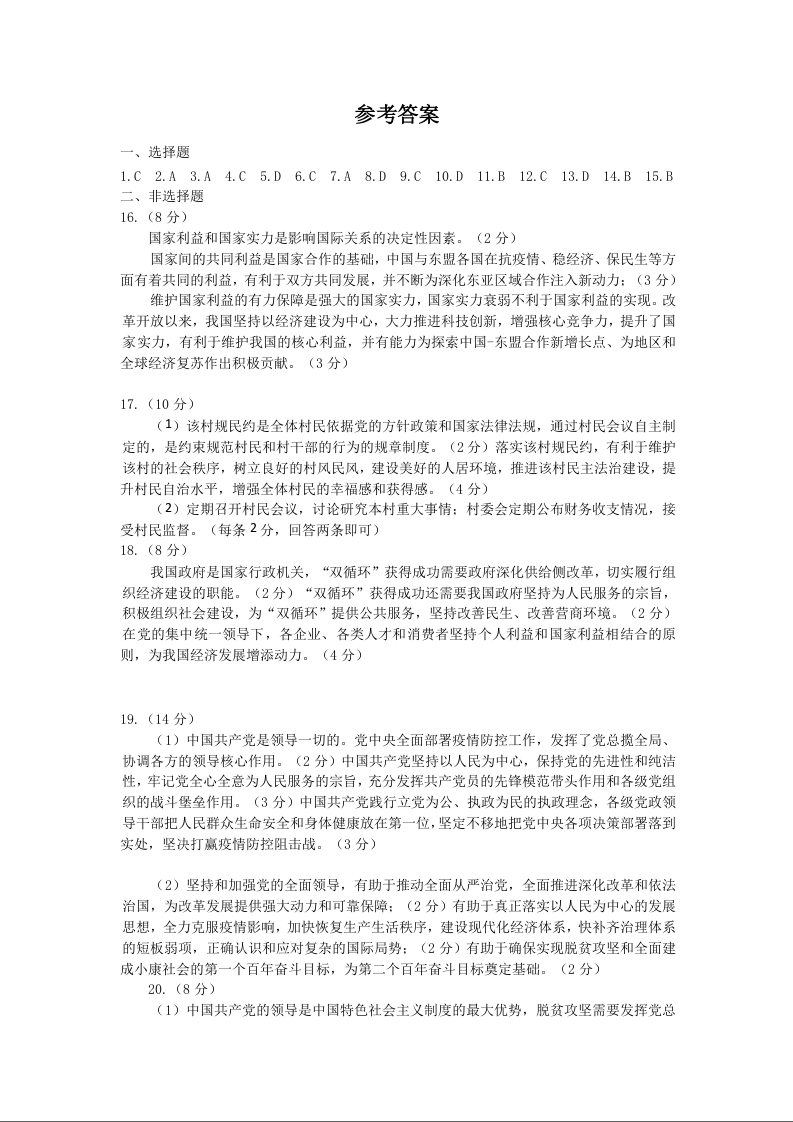 山东省潍坊市五县区2020.10高三年级阶段性监测试题政治答案