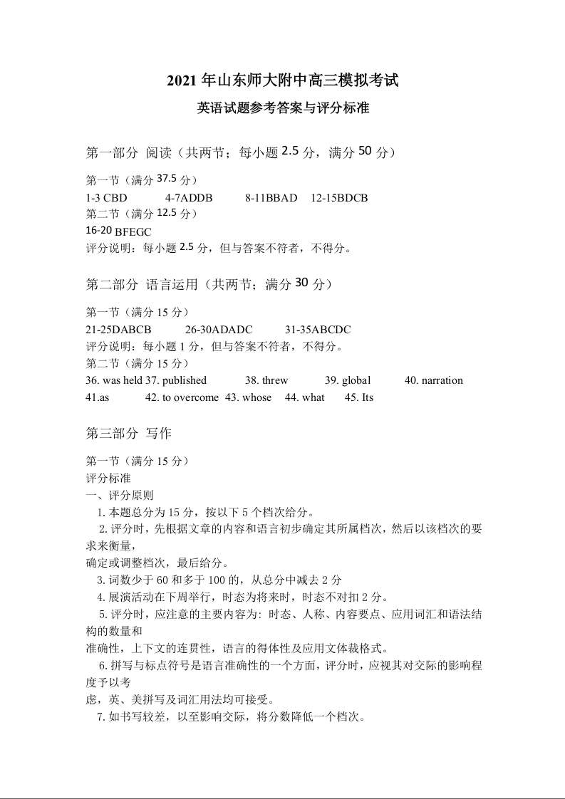 山东省师范大学附属中学2021.5考前模拟检测英语答案