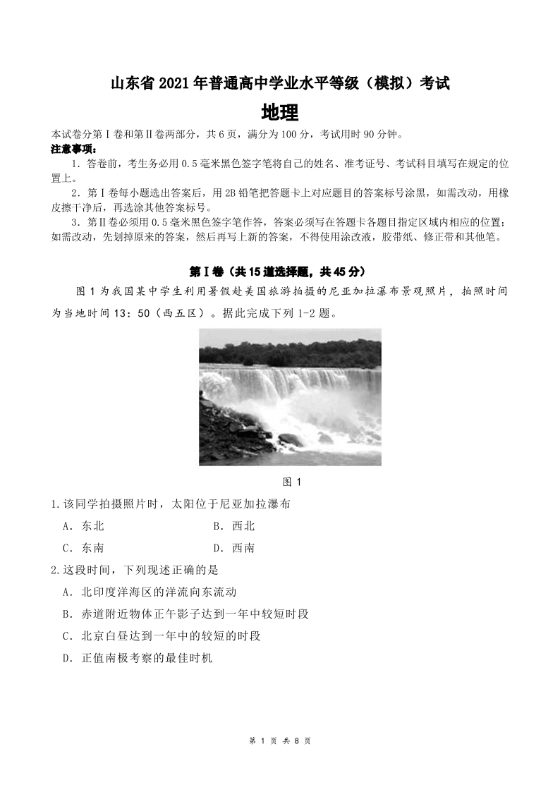 山东省师范大学附属中学2021.5考前模拟检测地理