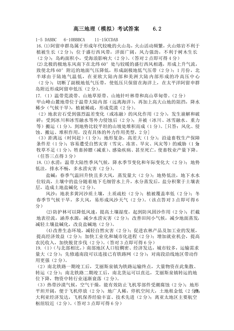 山东省师范大学附属中学2021.5考前模拟检测地理答案