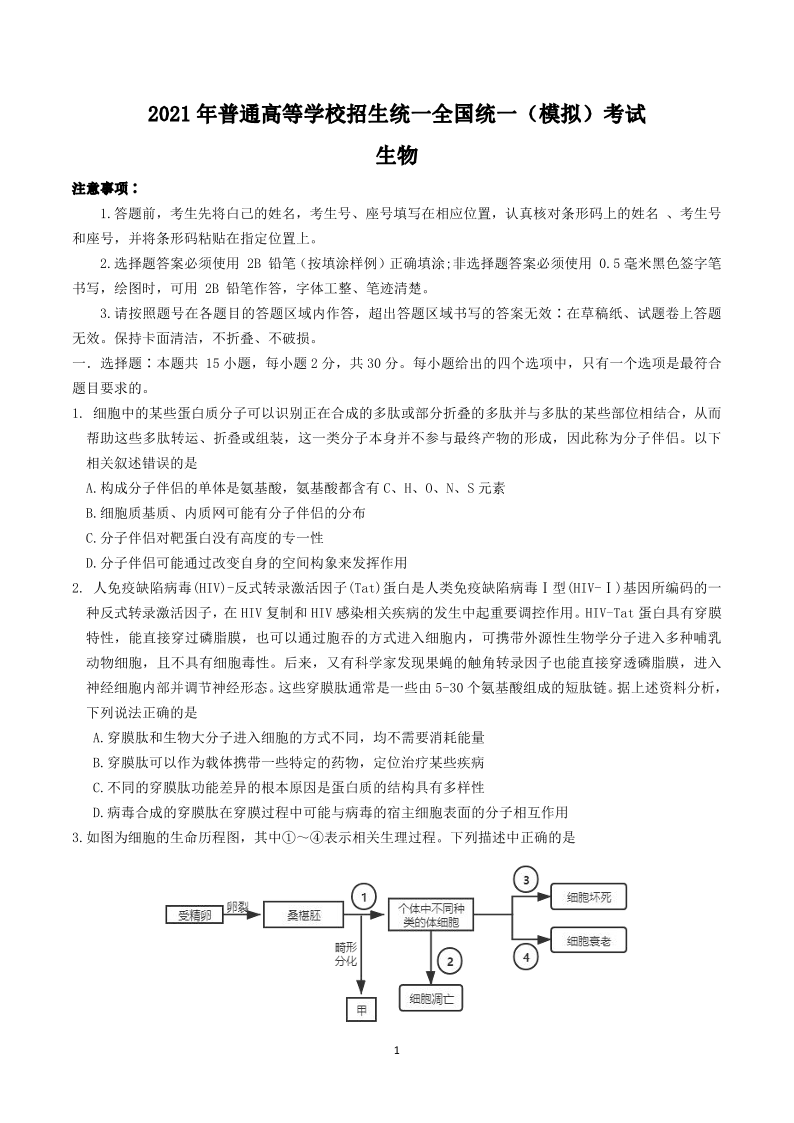 山东省师范大学附属中学2021.5考前模拟检测生物