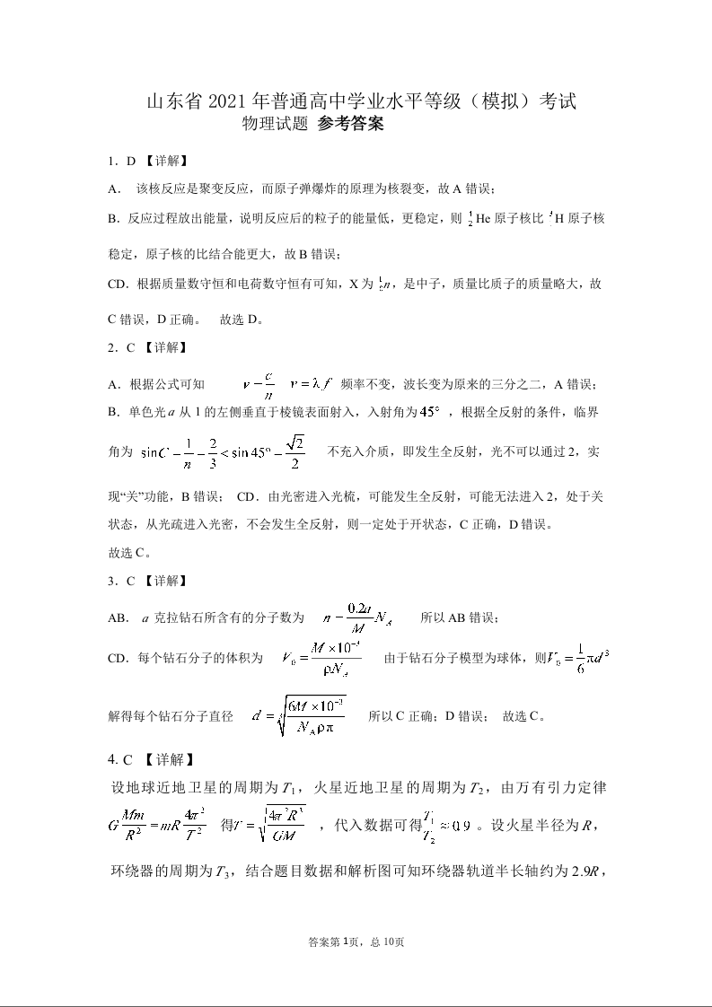 山东省师范大学附属中学2021.5考前模拟检测物理答案