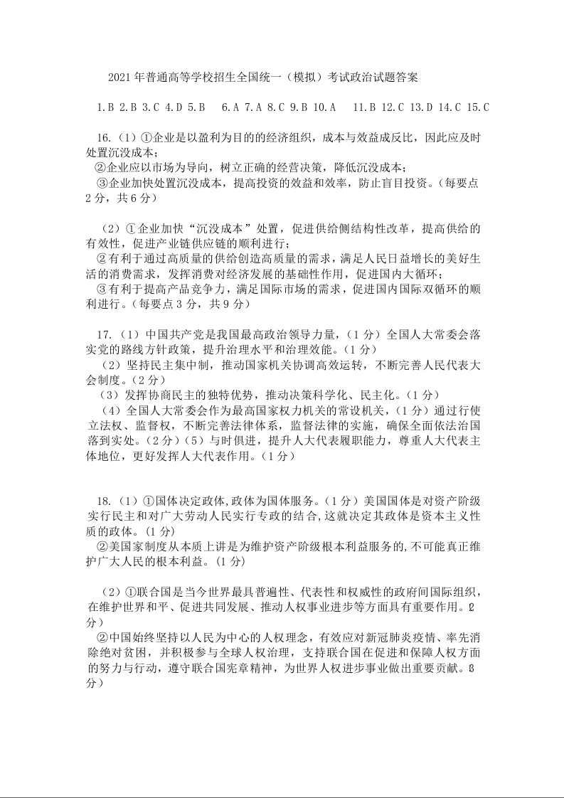 山东省师范大学附属中学2021.5考前模拟检测政治答案