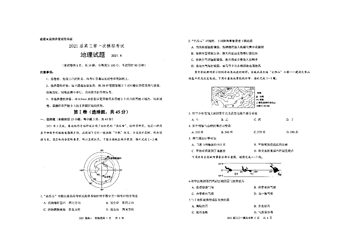 山东省实验中学2021.4第一次模拟地理试题