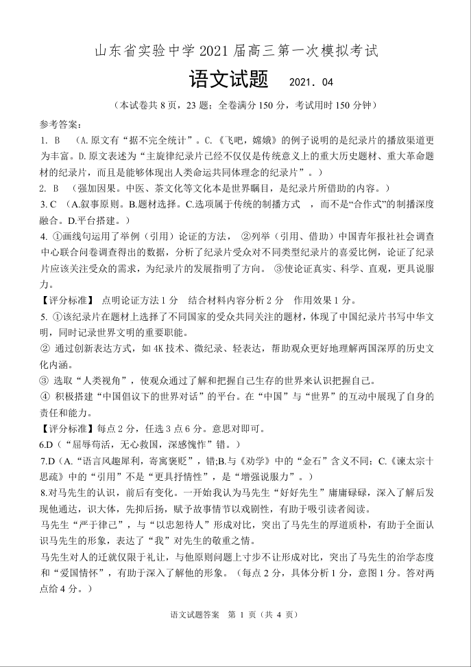 山东省实验中学2021.4第一次模拟语文答案