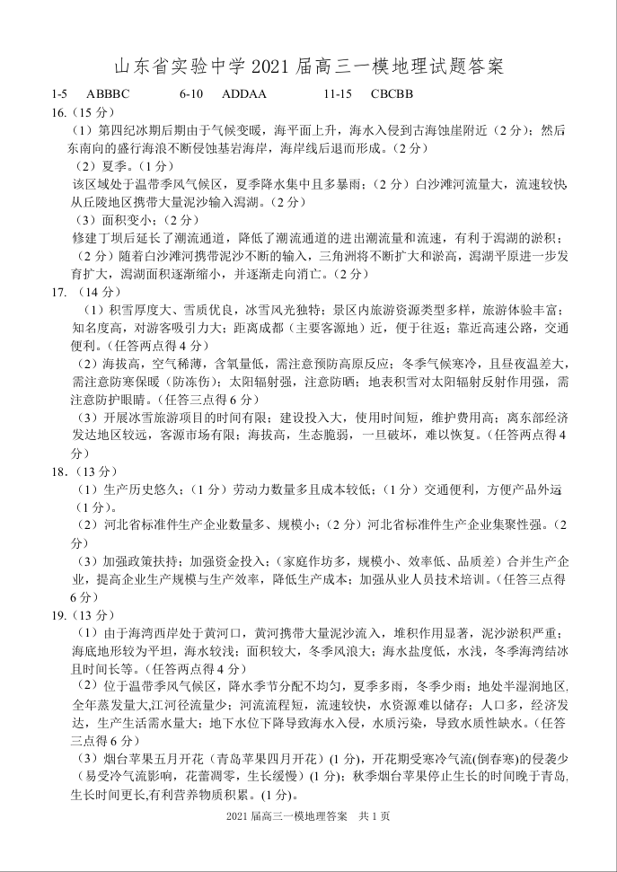 山东省实验中学2021.4第一次模拟地理答案