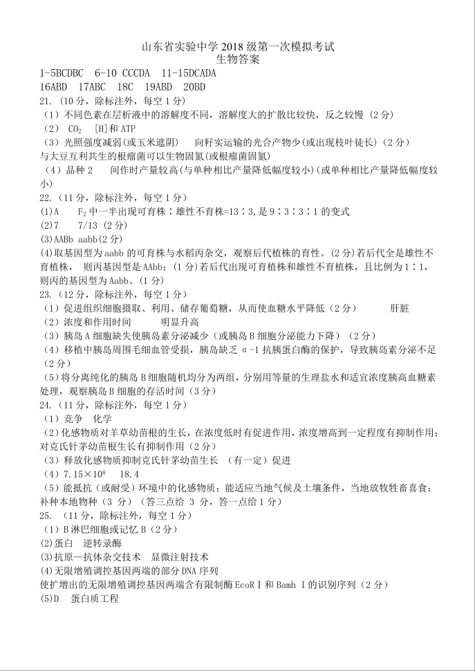 山东省实验中学2021.4第一次模拟生物答案