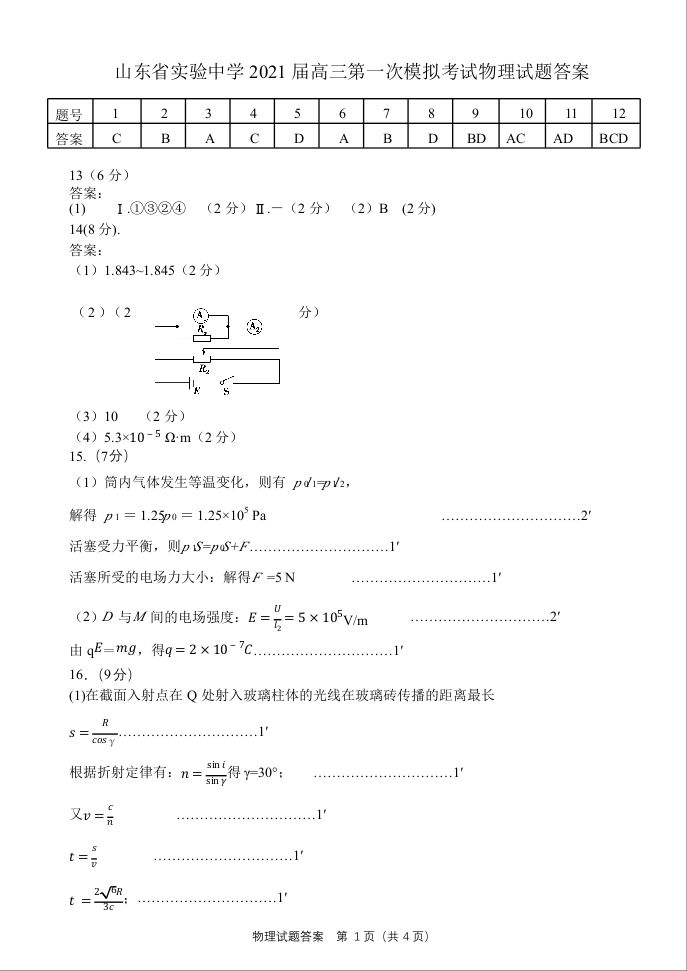 山东省实验中学2021.4第一次模拟物理答案
