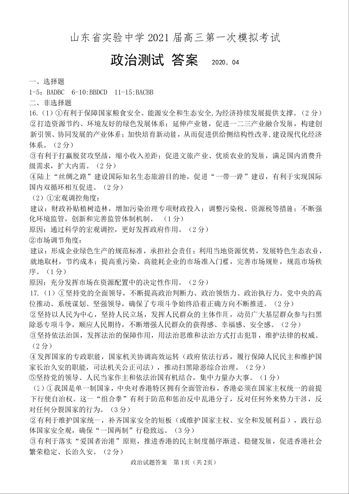山东省实验中学2021.4第一次模拟政治答案