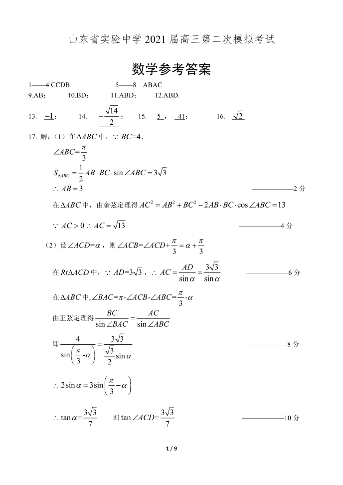 山东省实验中学2021.5考前模拟检测数学答案