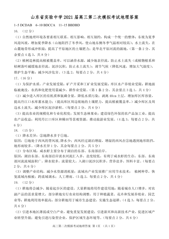 山东省实验中学2021.5考前模拟检测地理答案