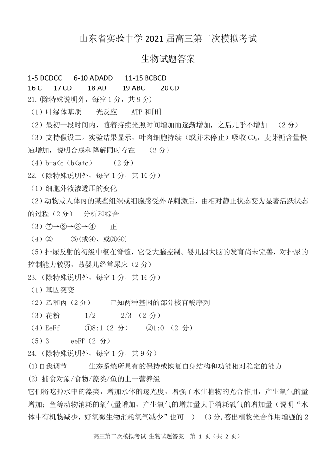 山东省实验中学2021.5考前模拟检测生物答案