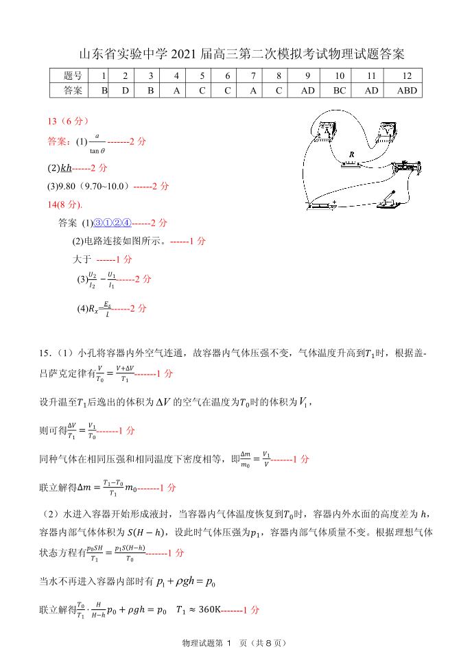 山东省实验中学2021.5考前模拟检测物理答案