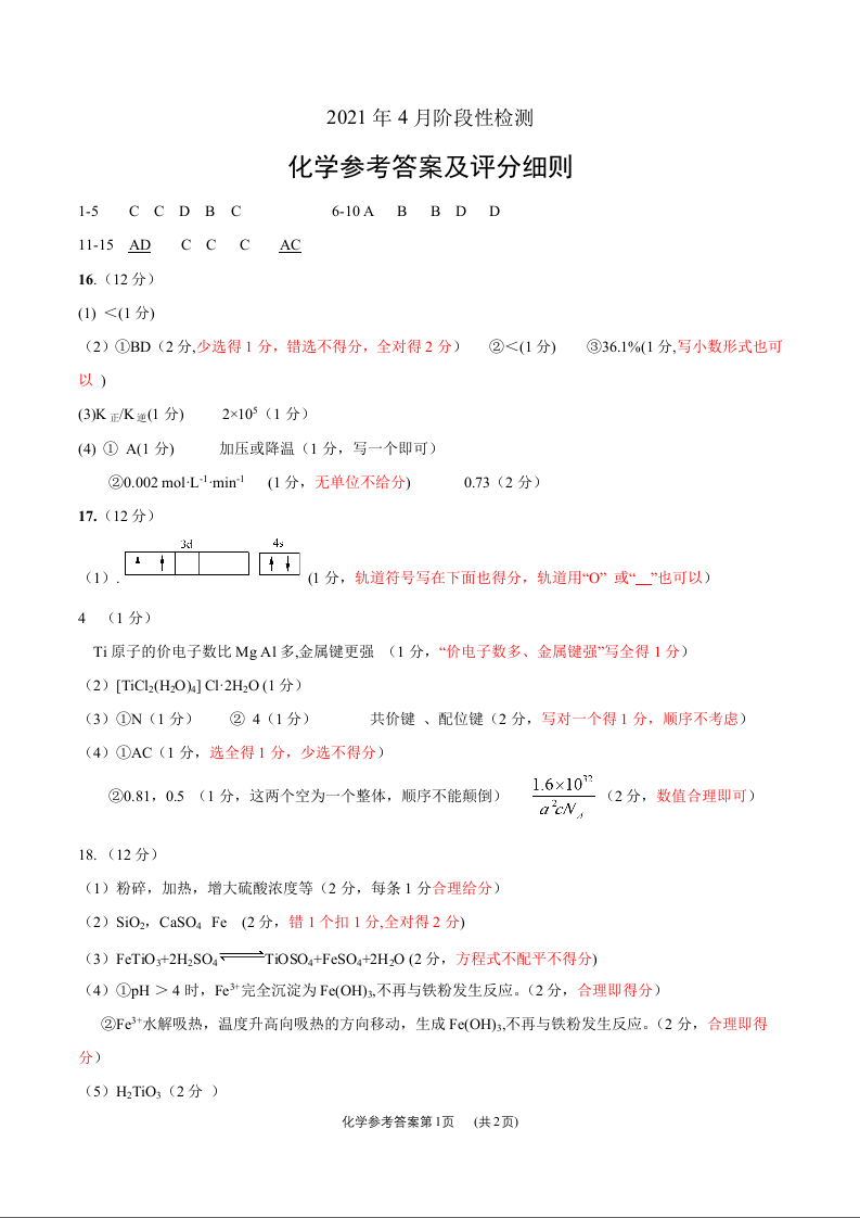 山东省济南市2021.4十一校联合模拟检测化学答案