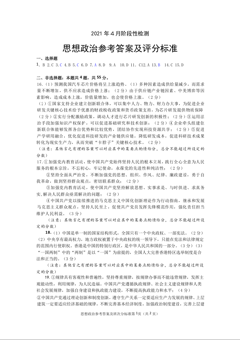 山东省济南市2021.4十一校联合模拟检测政治答案