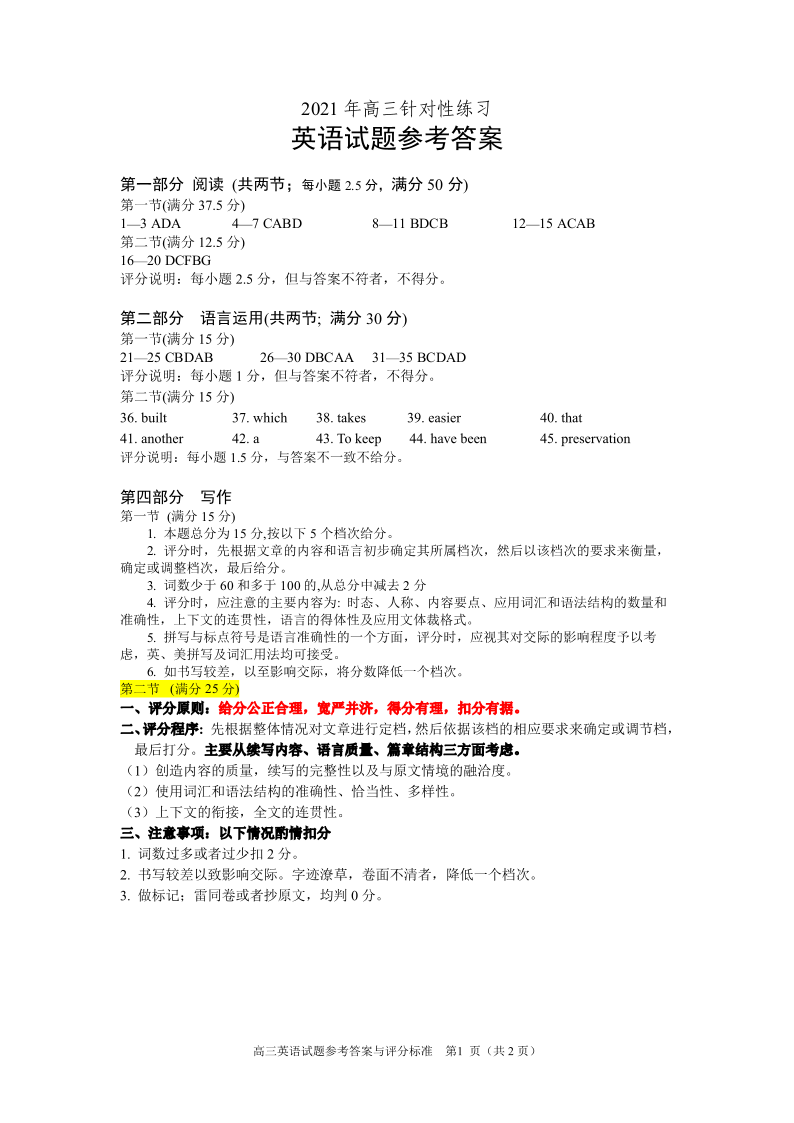 山东省济南市2021.5高三第二次模拟考试英语答案