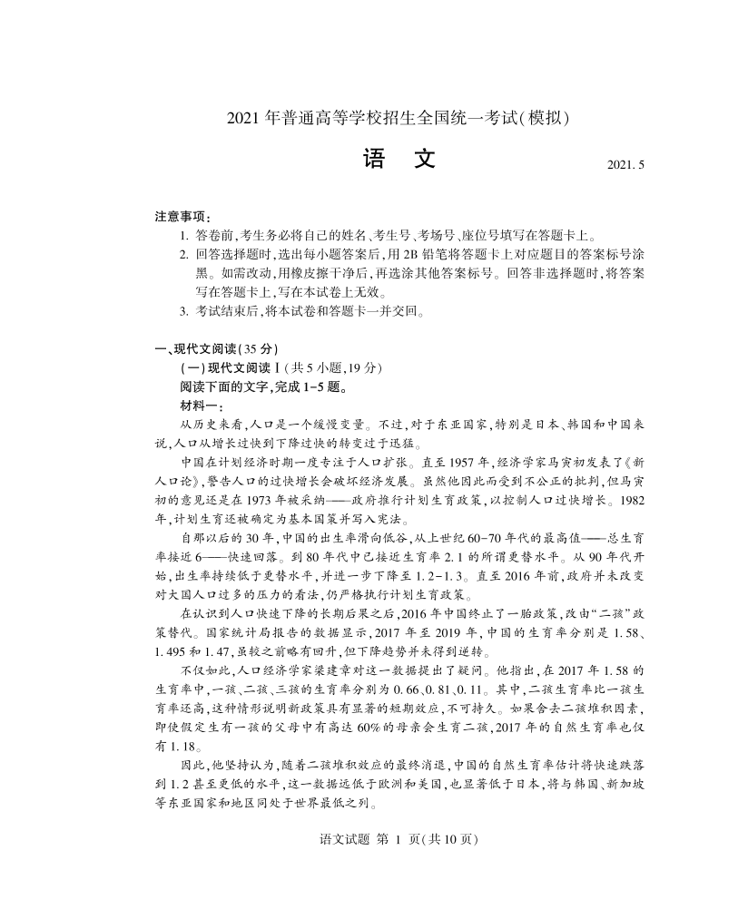 山东省临沂市2021.5临沂市高三第二次模拟考试语文试题及答案