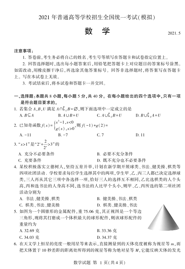 山东省临沂市2021.5临沂市高三第二次模拟考试数学试题及答案