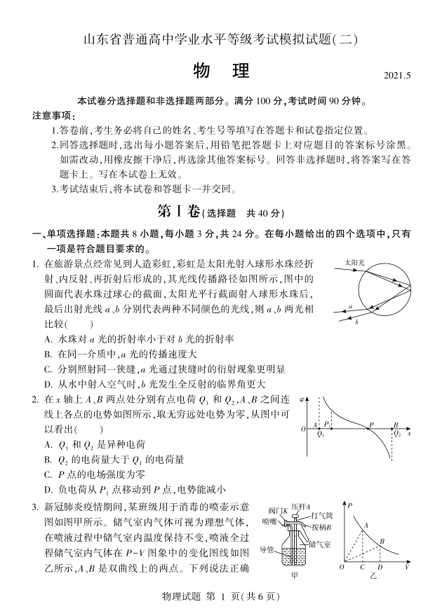 山东省临沂市2021.5临沂市高三第二次模拟考试物理试题及答案