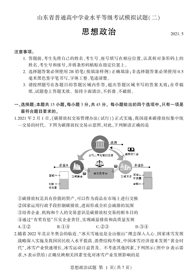 山东省临沂市2021.5临沂市高三第二次模拟考试政治试题及答案