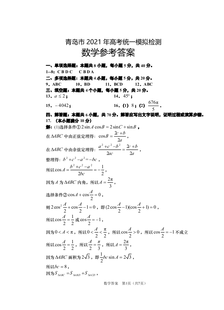 青岛市2021年高考统一模拟检测数学参考答案