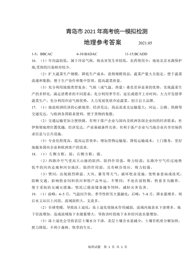青岛市2021年高考统一模拟检测地理参考答案