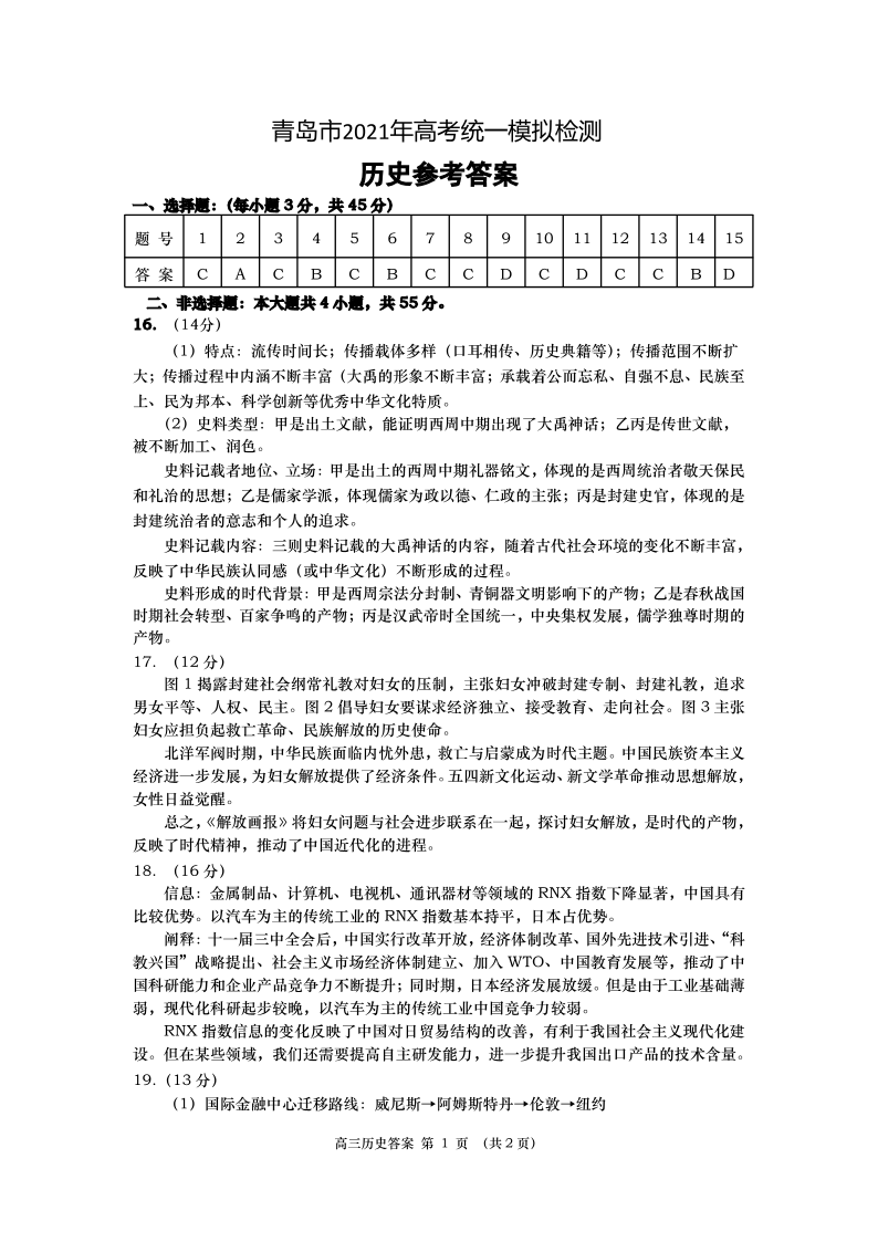 青岛市2021年高考统一模拟检测历史参考答案