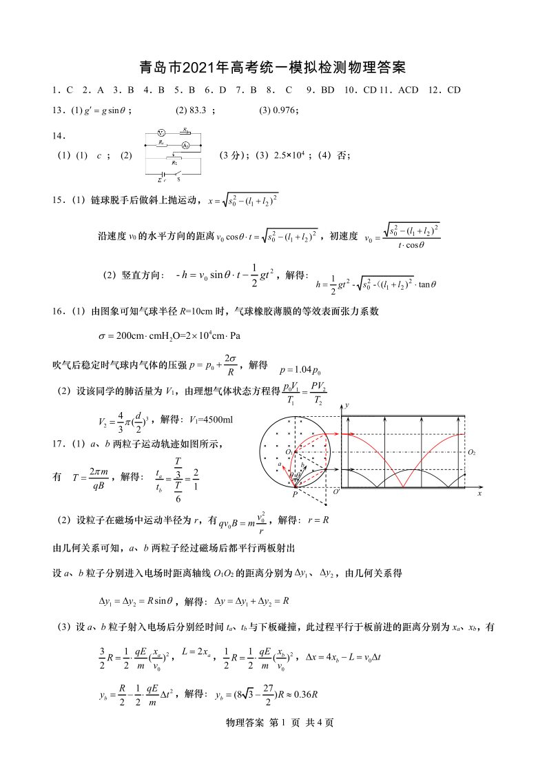 青岛市2021年高考统一模拟检测物理参考答案