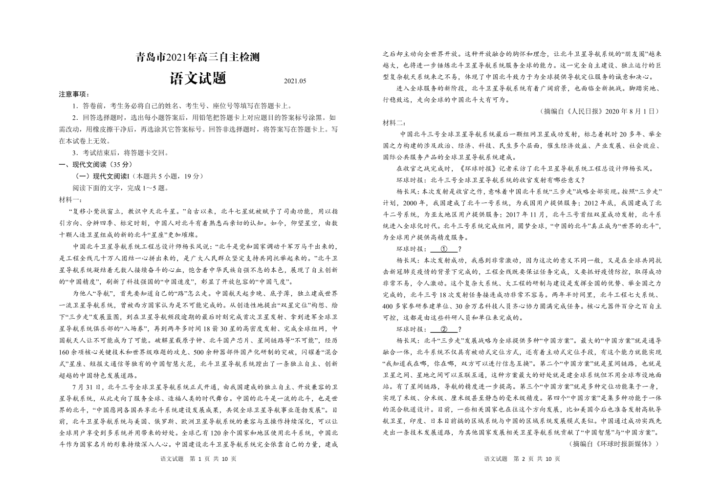 山东省青岛市2021.5高三第三次模拟考试语文