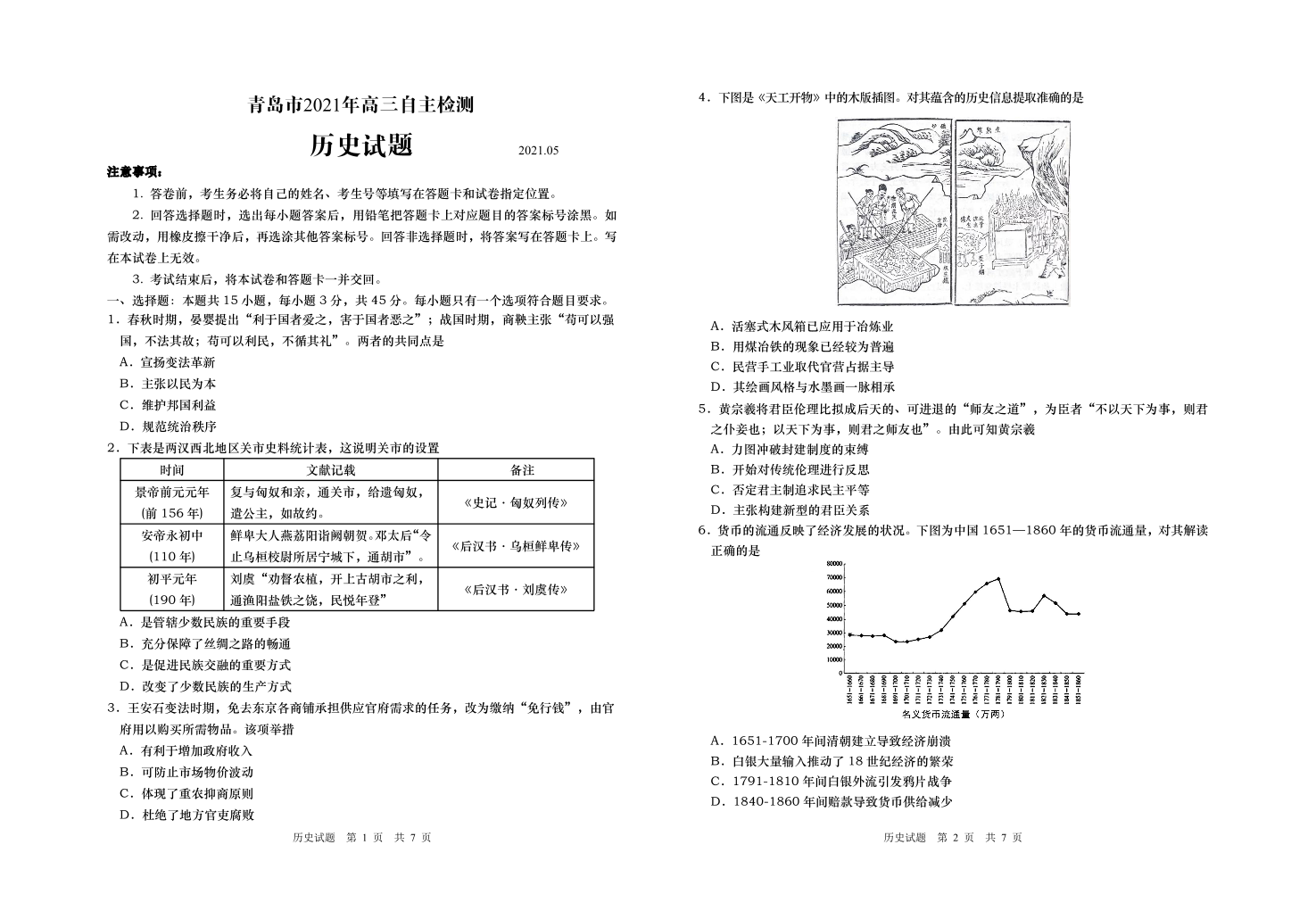 山东省青岛市2021.5高三第三次模拟考试历史