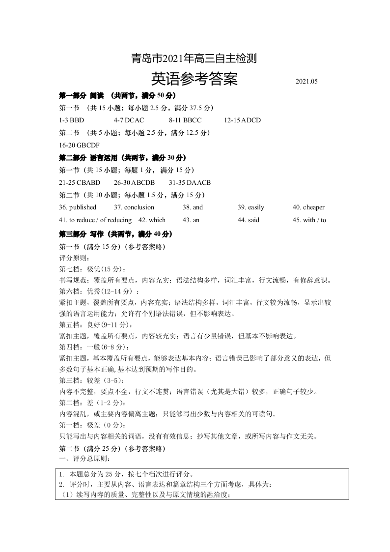 山东省青岛市2021.5高三第三次模拟考试英语答案