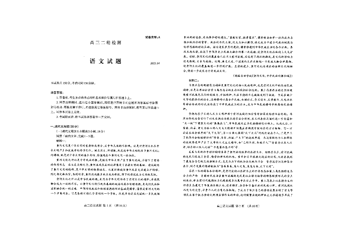 山东省泰安市2021.4高三第二次模拟考试语文