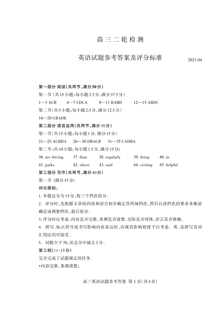 山东省泰安市2021.4高三第二次模拟考试英语答案