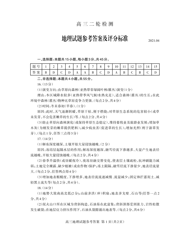 山东省泰安市2021.4高三第二次模拟考试地理答案