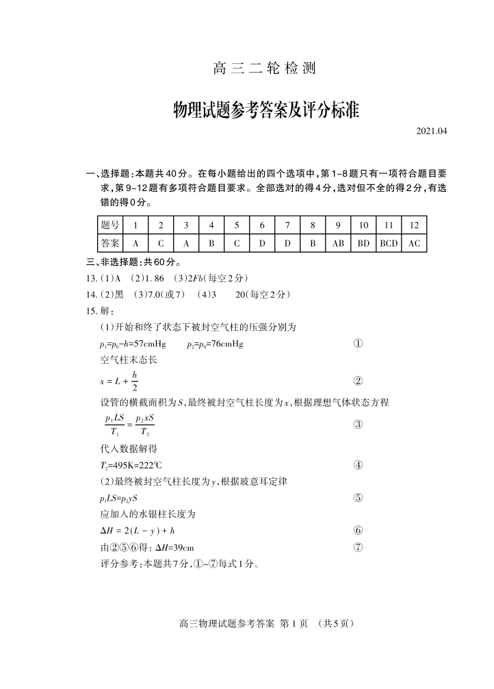 山东省泰安市2021.4高三第二次模拟考试物理答案