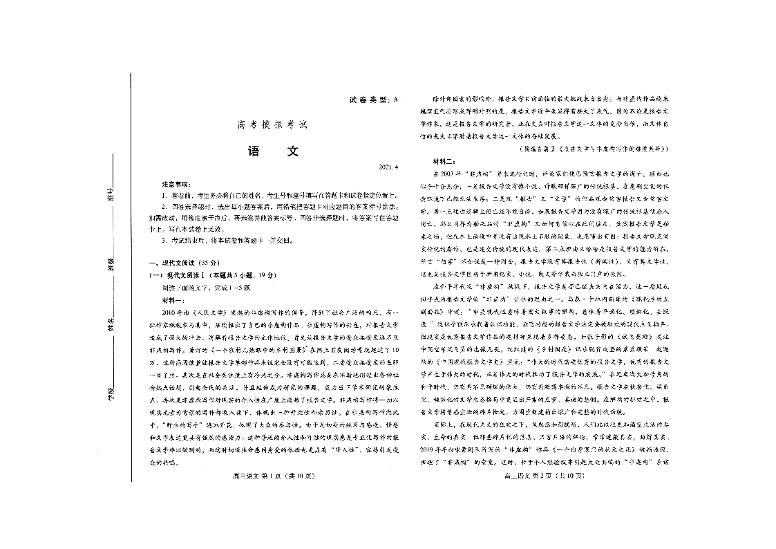 山东省潍坊市2021.4高三第二次模拟考试语文