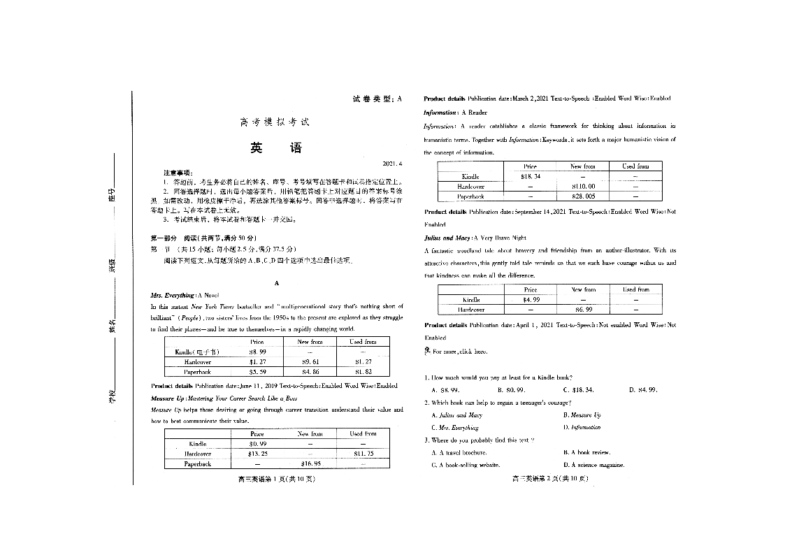 山东省潍坊市2021.4高三第二次模拟考试英语