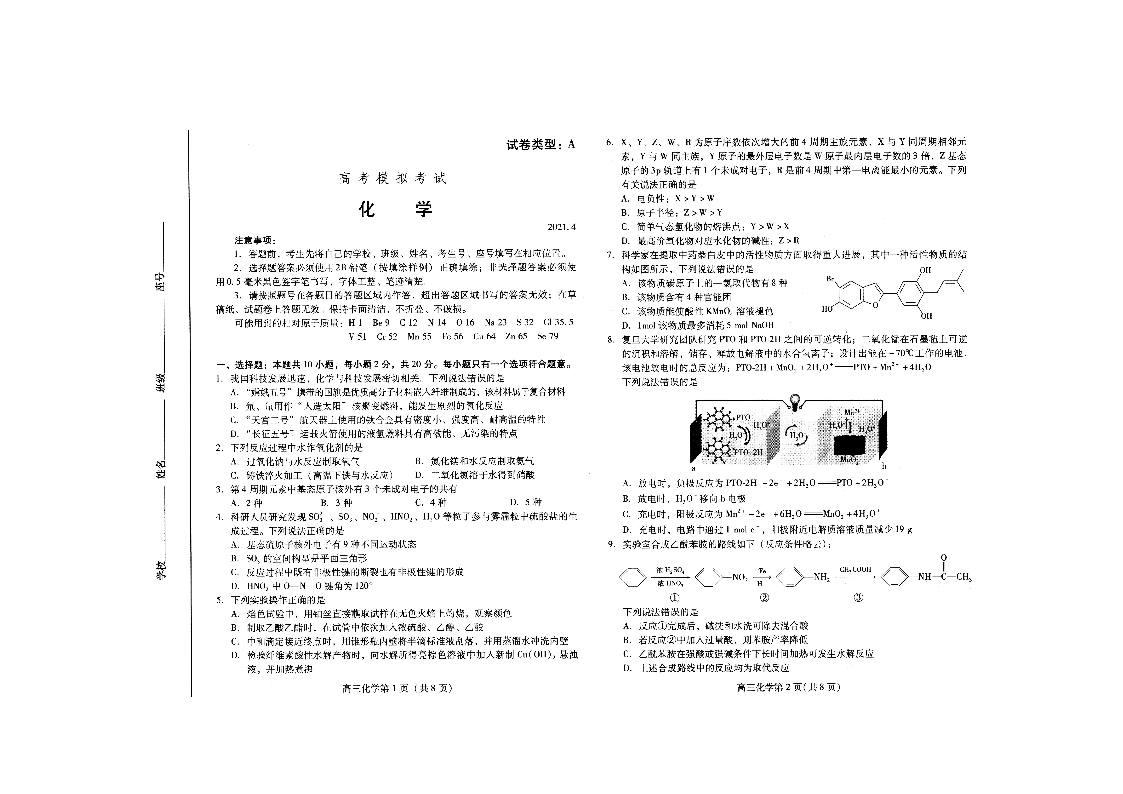 山东省潍坊市2021.4高三第二次模拟考试化学