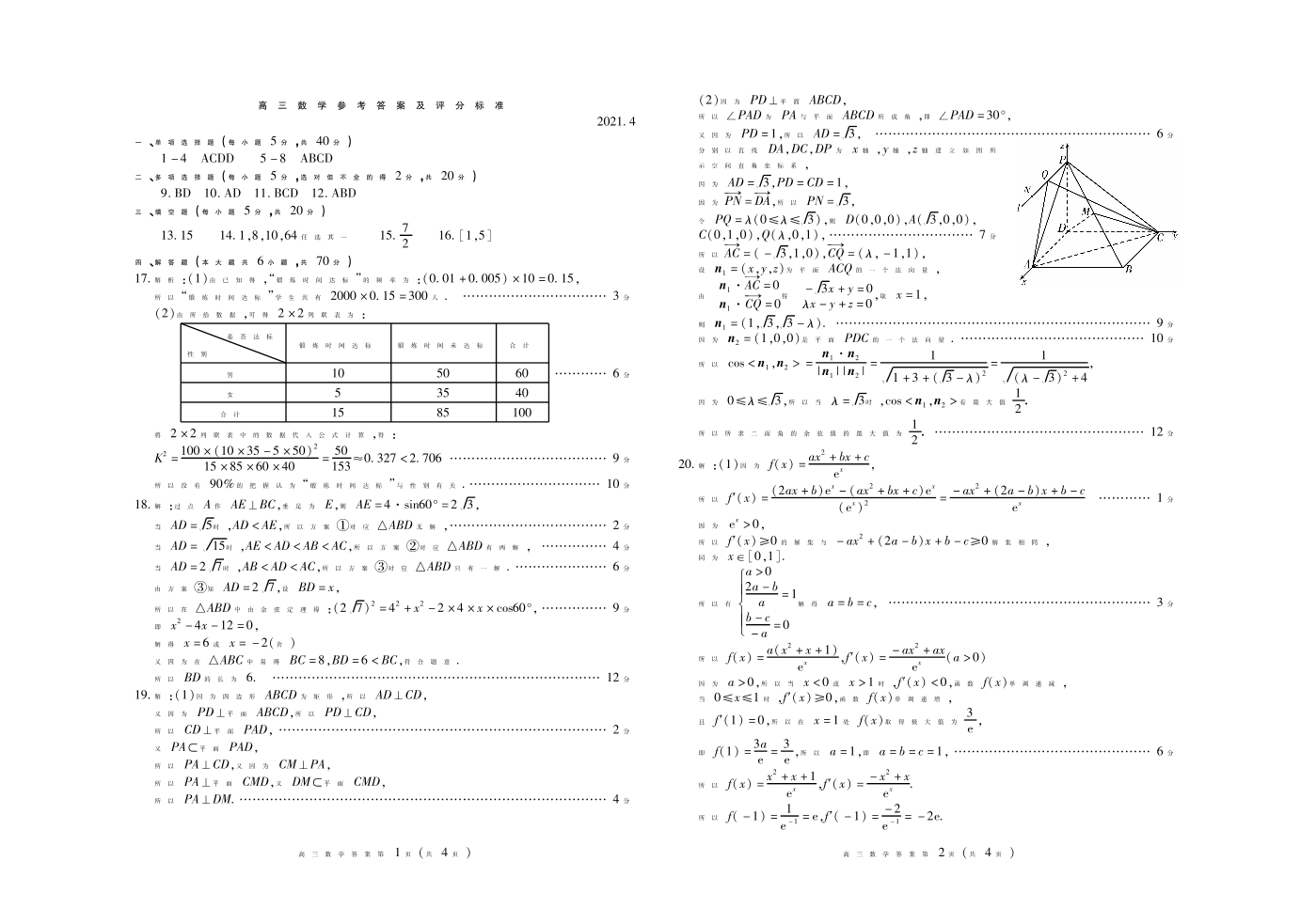 山东省潍坊市2021.4高三第二次模拟考试数学答案