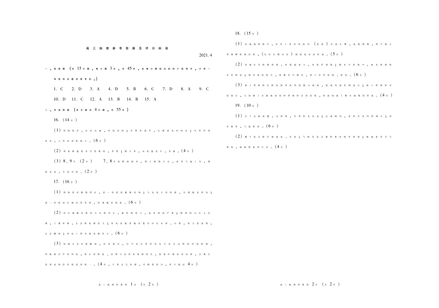 山东省潍坊市2021.4高三第二次模拟考试地理答案
