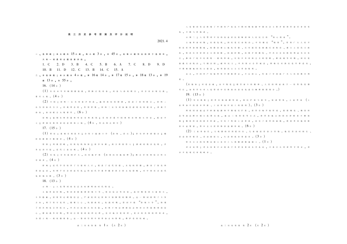 山东省潍坊市2021.4高三第二次模拟考试历史答案