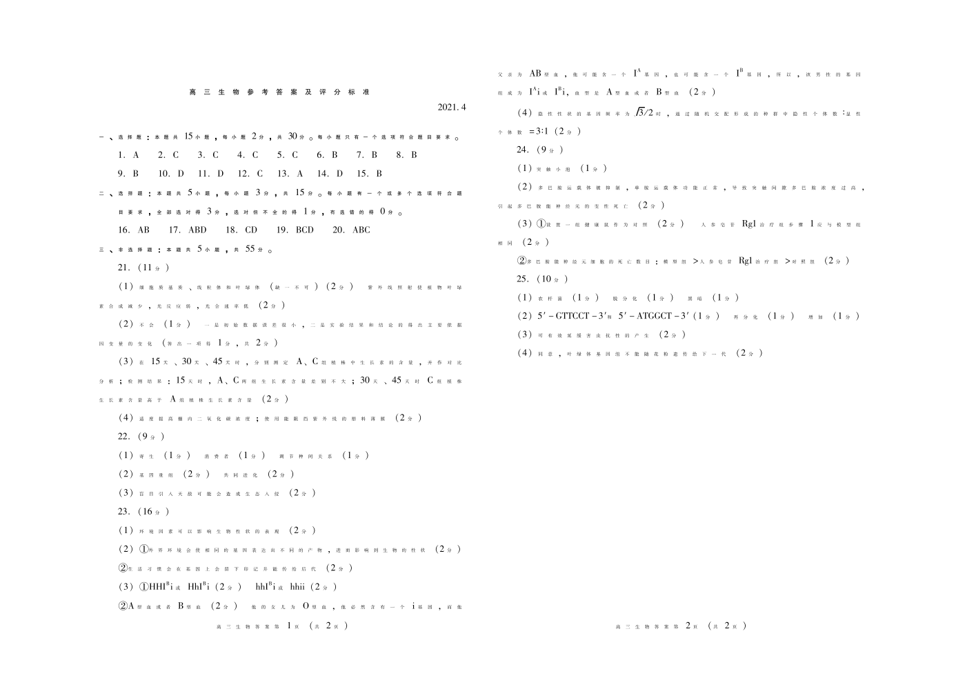 山东省潍坊市2021.4高三第二次模拟考试生物答案