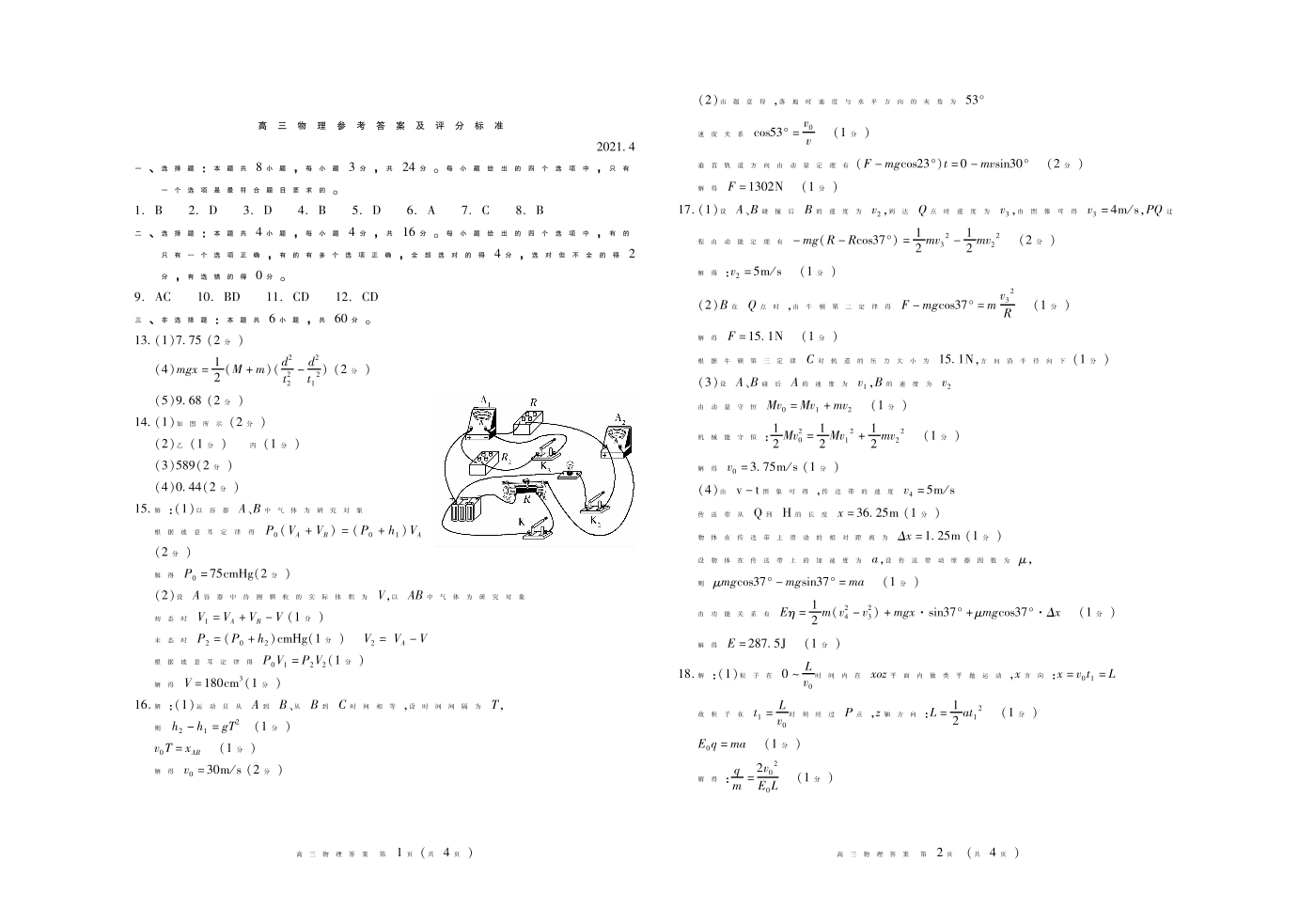 山东省潍坊市2021.4高三第二次模拟考试物理答案