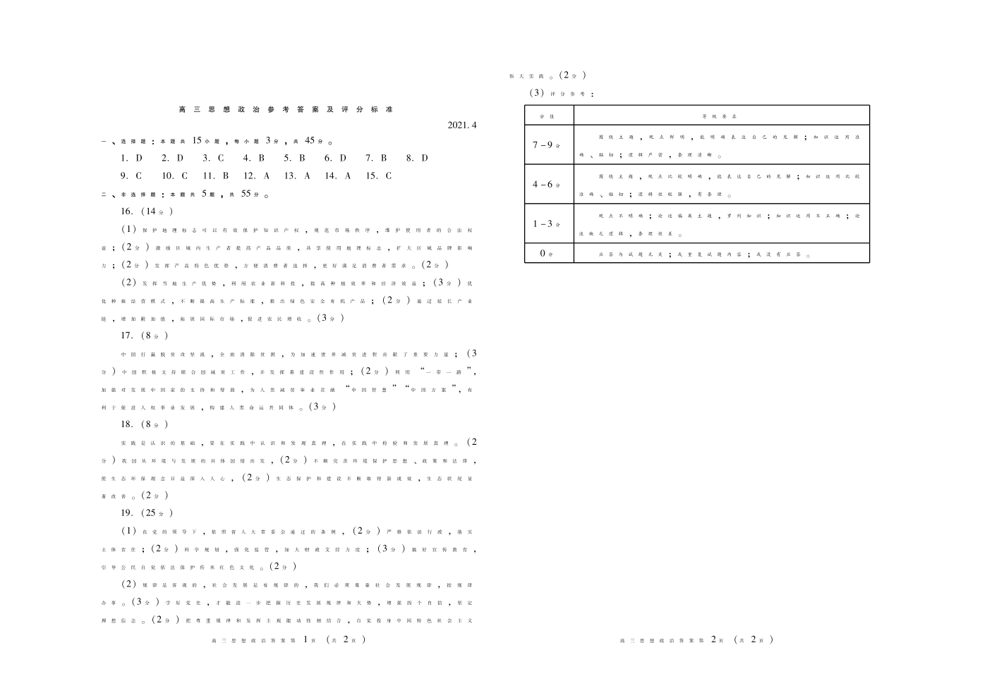 山东省潍坊市2021.4高三第二次模拟考试政治答案