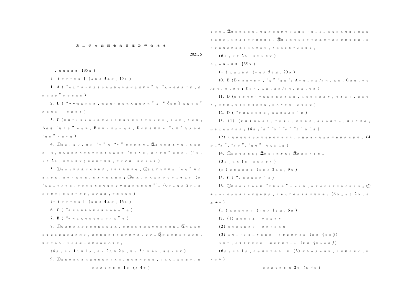 山东省潍坊市2021.5高二期中统一检测试题语文答案